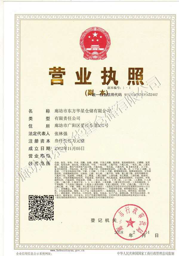 廊坊?jng)东方华星仓储有限公司成立?002q?1月,占地100亩,l廊坊市(jng)工商局注册l河北省对外贸易局批准成立的外贸型企业?